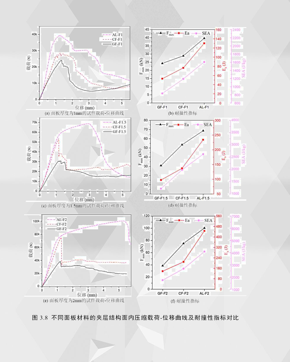 通過比較面板厚度相同但材料不同的夾層結(jié)構(gòu)載荷-位移曲線,如圖3.8所示,可發(fā)現(xiàn)鋁合金夾層結(jié)構(gòu)的曲線高度明顯高于同等面板厚度下的纖維增強(qiáng)夾層結(jié)構(gòu)。由于鋁合金面板的彈性模量比纖維增強(qiáng)復(fù)合材料的大,所以夾層結(jié)構(gòu)在第一階段(彈性階段)的斜率最大,即剛度最大。從基材力學(xué)測試的數(shù)據(jù)可以看出,鋁合金面板的極限強(qiáng)度比纖維增強(qiáng)復(fù)合材料面板的強(qiáng)度要低,但通過耐撞性指標(biāo)可以看出,鋁合金夾層結(jié)構(gòu)具有最大的峰值力,造成這種現(xiàn)象的主要原因是由于面板為脆性材料的纖維增強(qiáng)夾層結(jié)構(gòu)的上、下面板之間尺寸誤差或裝配誤差的疊加效應(yīng)對載荷的損失比面板為彈塑性材料的鋁合金夾層結(jié)構(gòu)的要大得多,而這種疊加效應(yīng)對彈塑性材料的極限承載能力影響非常小,從而解釋了鋁合金夾層結(jié)構(gòu)比纖維夾層結(jié)構(gòu)具有更大的極限載荷。此外,在纖維增強(qiáng)夾層結(jié)構(gòu)的失效過程可以看出,纖維增強(qiáng)夾層結(jié)構(gòu)面板的脆性斷裂通常首先僅發(fā)生在某一面板,而不是兩面板同時(shí)脆性斷裂,這也解釋了面板疊加效應(yīng)的存在。通過不同面板材料的夾層結(jié)構(gòu)面內(nèi)壓縮的耐撞性指標(biāo)比較可以看出,在具有相同尺寸配置的前提下,鋁合金夾層結(jié)構(gòu)有最好的耐撞性能,而玻璃纖維夾層結(jié)構(gòu)有最差的耐撞性能。